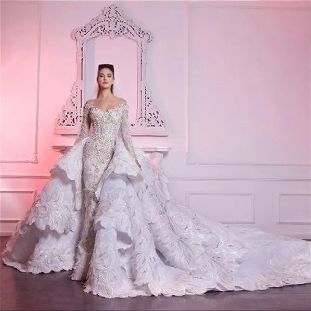 Robe De Mariee Luxury Lace Mermaid Wedding Dress With Detachable Train Romantic Long Sleeve Beads Tiered Wedding Bridal Gowns