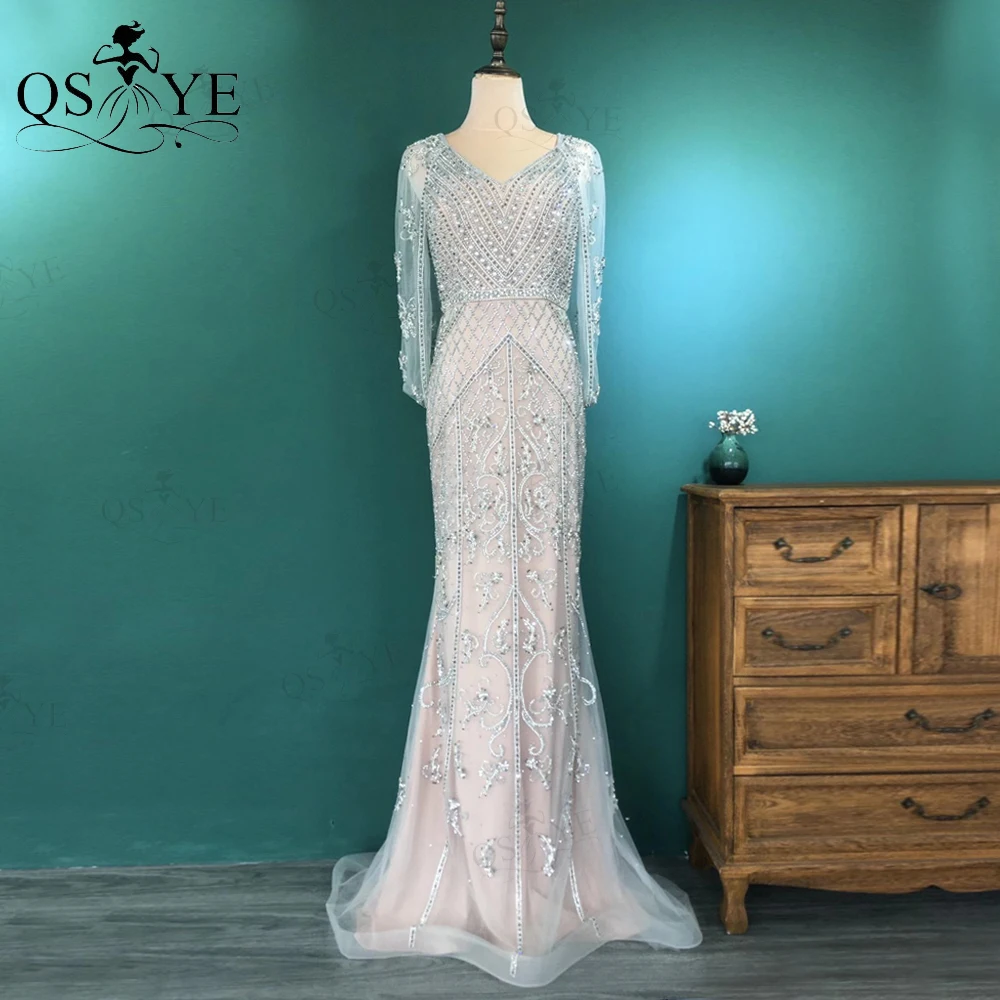 QSYYE High Quality Glitter Silver Mermaid Prom Dress Long Shawl Sleeves Shiny Evening Dress Beadings Sequin Lace Party Dress